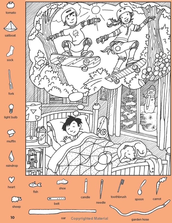 At first glance this image feels calm and cozy. A child sleeps peacefully in bed while a loyal dog curls up nearby. Outside the window winter rests quietly with a snowman standing guard. But floating above the bed something magical happens. Two kids soar through the sky on skateboards like heroes in a dream. What looks like a bedtime illustration quickly transforms into a clever hidden object puzzle that challenges your focus patience and imagination all at once.