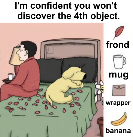 The mug feels obvious until you realize you might be looking at the wrong one. The wrapper could blend into fabric folds or shadows. The banana shape might echo curves you dismiss as part of the dog or bedding. The frond may disguise itself as decoration or pattern.