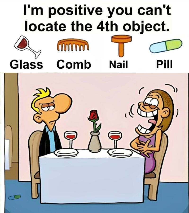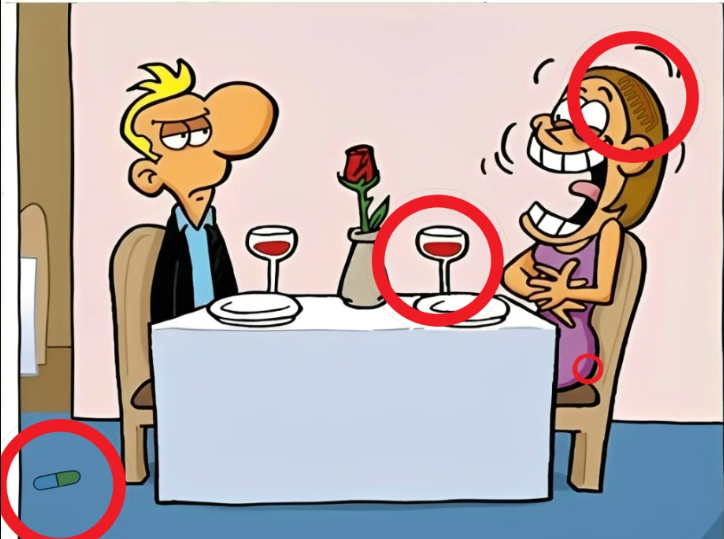 At first glance, this cartoon looks simple, almost playful. A couple sits at a dinner table, wine glasses raised, a rose between them. Above the scene, a bold challenge stares back at you, daring you to find the fourth hidden object. Sounds easy, right? That confidence is exactly what makes this image so powerful. It pulls you in, disarms you with humor, then quietly puts your brain to work.