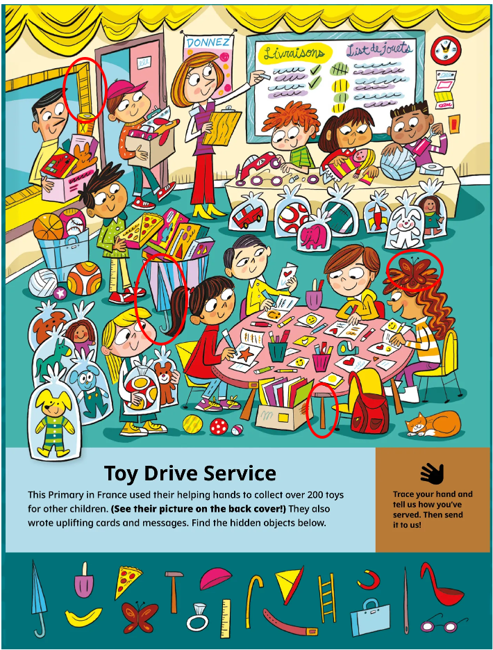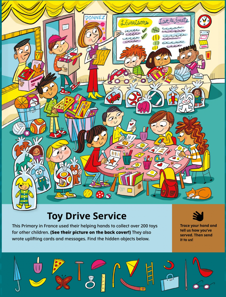 At first glance this picture feels loud busy and joyful in the best possible way. Kids laugh. Adults organize. Toys pile up everywhere. The room buzzes with energy and purpose. But this is not just a cheerful illustration. It is a hidden object puzzle wrapped inside a powerful story about generosity teamwork and service. The longer you look the more layers reveal themselves and that is exactly what makes this image so engaging.