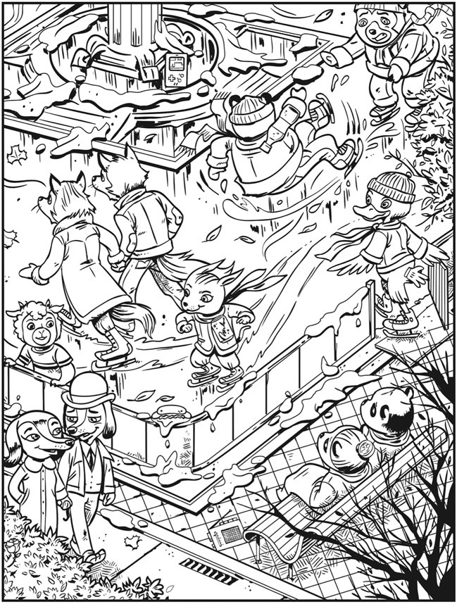 One of the most charming elements of this illustration is how human the animal characters feel. Foxes, bears, birds, and other creatures wear winter clothes, react emotionally, and interact just like people would in a crowded park.