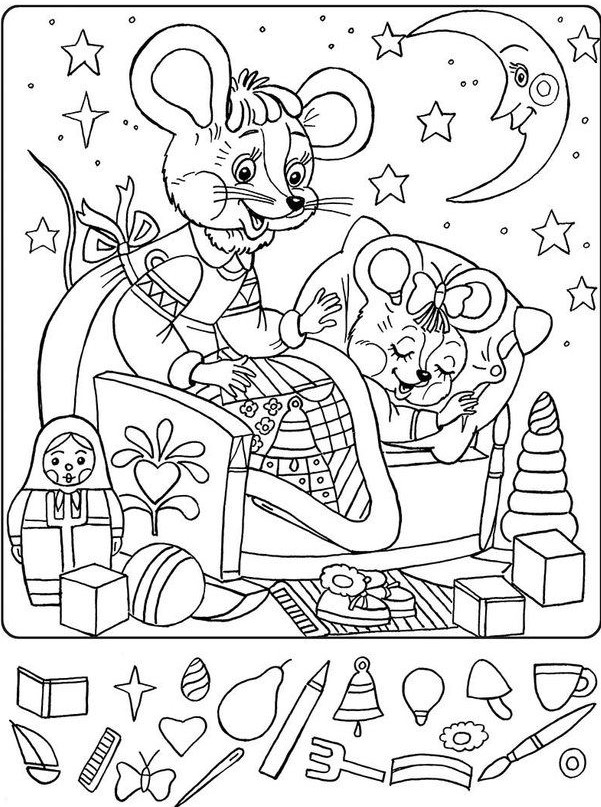 At first glance, the scene before us appears like a lovely bedtime story. A cozy little mouse family, surrounded by stars and moonlit skies, creates a peaceful and magical atmosphere. The older mouse, donning a lovely dress and an endearing smile, is caring for her little one, who’s ready to drift off to sleep. From the bedding to the moon in the sky, everything in this illustration oozes comfort and serenity. But here’s the catch: hidden within this picture are multiple objects and surprises, waiting to be uncovered.