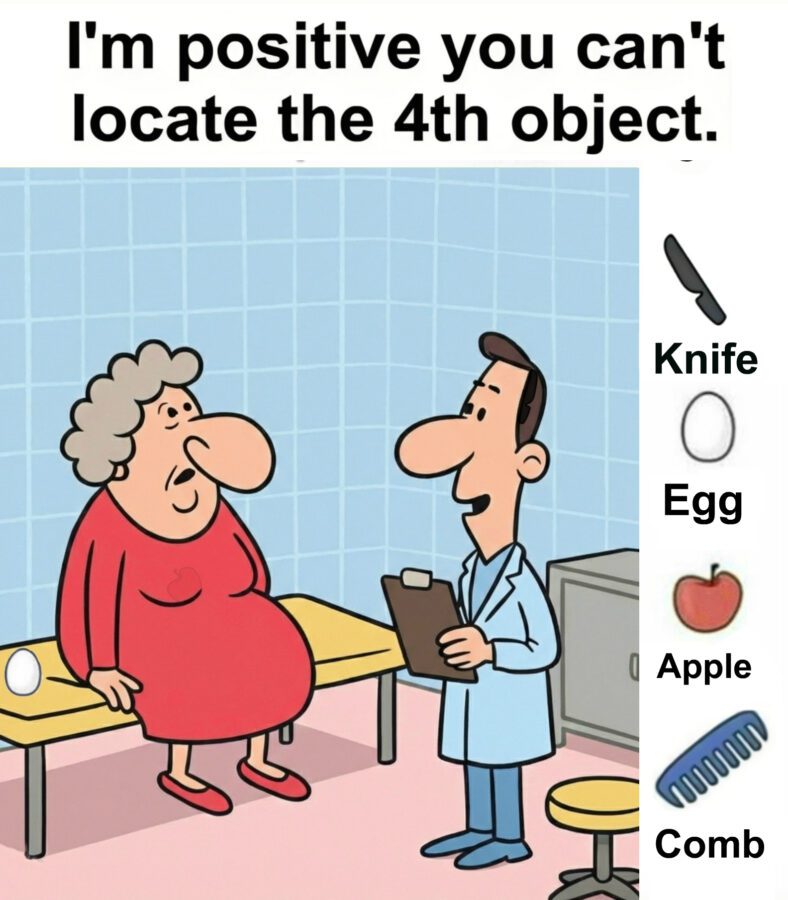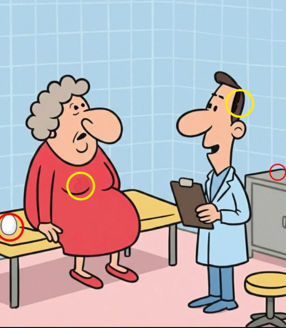 This clever doctor’s office hidden object puzzle transforms an ordinary medical scene into a brain-boosting challenge. By hiding a knife, egg, apple, and comb within a simple cartoon setting, the image encourages viewers to shift perspective and examine details more carefully.