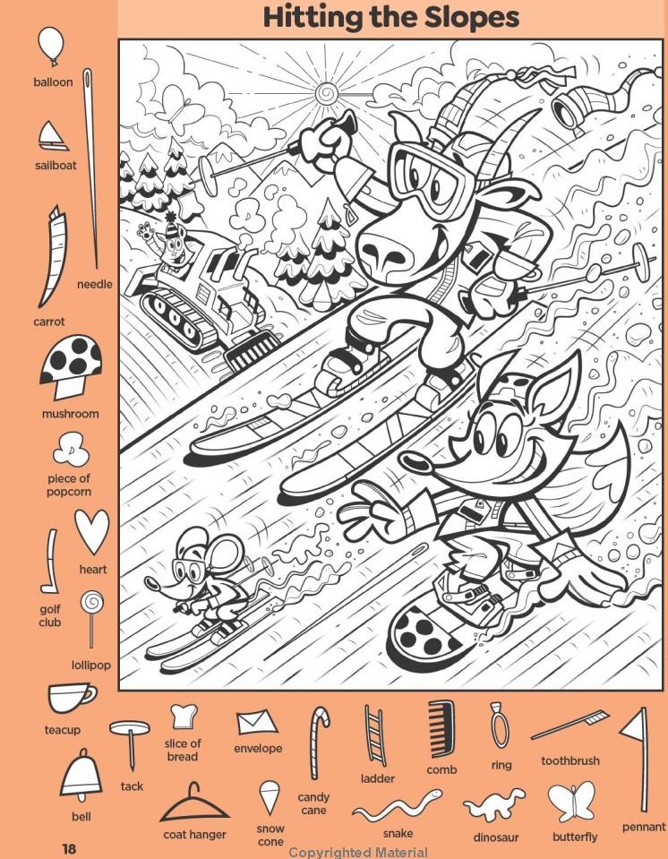 This isn’t just a charming ski scene. It’s a cleverly designed hidden object puzzle packed with visual surprises. Scattered throughout the slopes are everyday items—like a balloon, sailboat, needle, carrot, mushroom, popcorn, heart, golf club, lollipop, teacup, bell, ladder, comb, toothbrush, butterfly, and more—expertly disguised within the snow, trees, and motion lines.