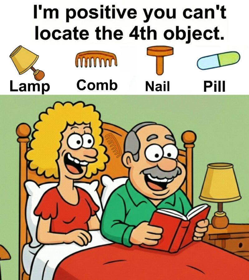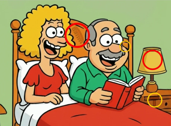 At first glance this image feels calm warm and almost cozy. A couple sits up in bed smiling and relaxed. One person reads a book while soft bedside lamps frame the scene. Above the illustration a confident statement challenges the viewer by claiming you cannot locate the fourth object.