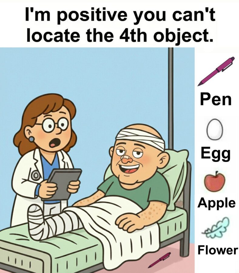 This hospital-themed hidden object puzzle transforms an ordinary medical scene into a clever visual challenge. By asking viewers to locate a pen, egg, apple, and flower within a simple cartoon illustration, the image pushes us to shift from passive viewing to active observation.