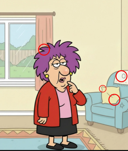 At first glance, this cartoon living room scene looks simple and almost humorous. A woman with bright purple hair stands in the middle of the room, touching her chin as if she is thinking deeply. Behind her, a cozy couch sits against the wall. A soft pillow rests neatly on it. A window lets in natural light, revealing a calm backyard view.