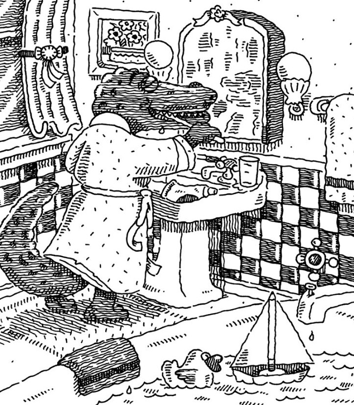 Why is the crocodile brushing its teeth? Does it live here alone? Does it sail toy boats in the tub every morning? These questions make the illustration the perfect starting point for big imaginations—especially for kids.