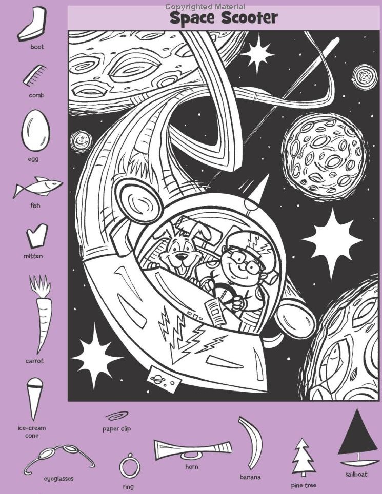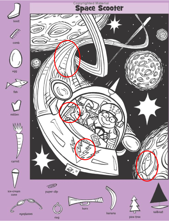 One of the smartest choices in this puzzle is the object list itself. A boot a comb an egg a fish a mitten a carrot an ice cream cone and more. These everyday items do not belong in space.
