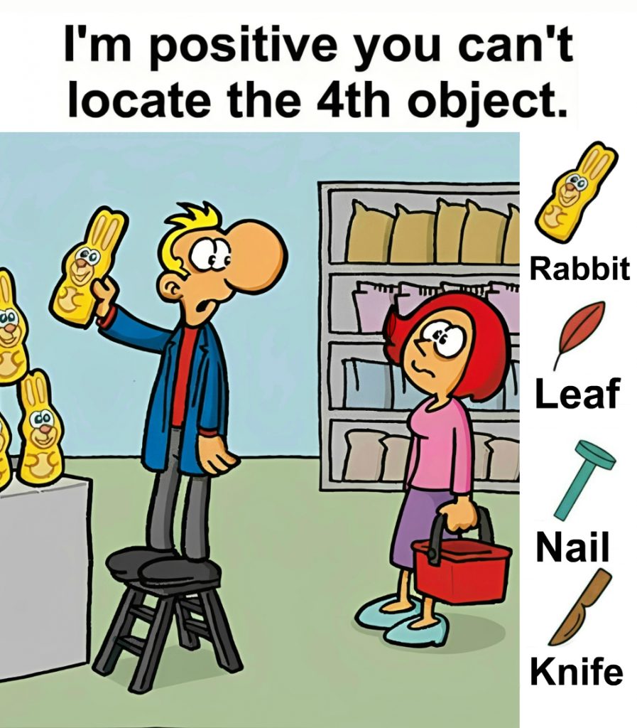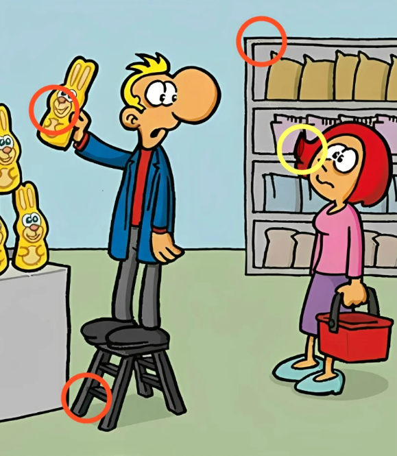 At first glance this image feels playful funny and harmless. A quirky cartoon scene unfolds inside what looks like a shop. A man stands on a stool holding up a chocolate rabbit. A woman watches him with a mix of confusion and suspicion. Shelves line the wall. Everything looks normal until your brain kicks in and reads the challenge at the top.