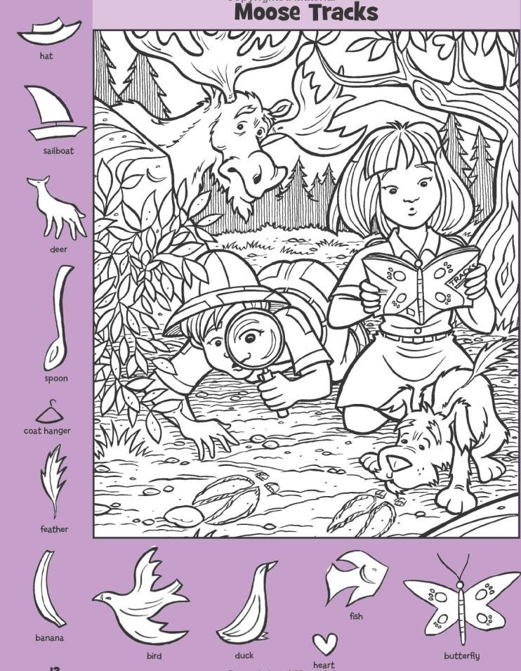 The “Moose Tracks” hidden object puzzle blends outdoor adventure, cognitive development, and family-friendly fun into one beautifully illustrated scene. By hiding everyday objects within a forest setting, it transforms a simple drawing into an engaging brain challenge.