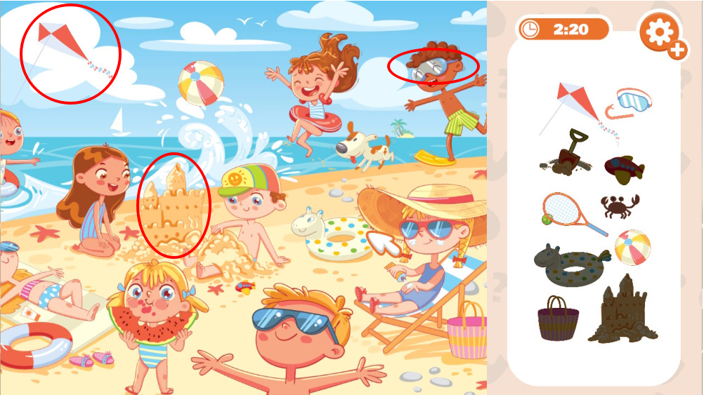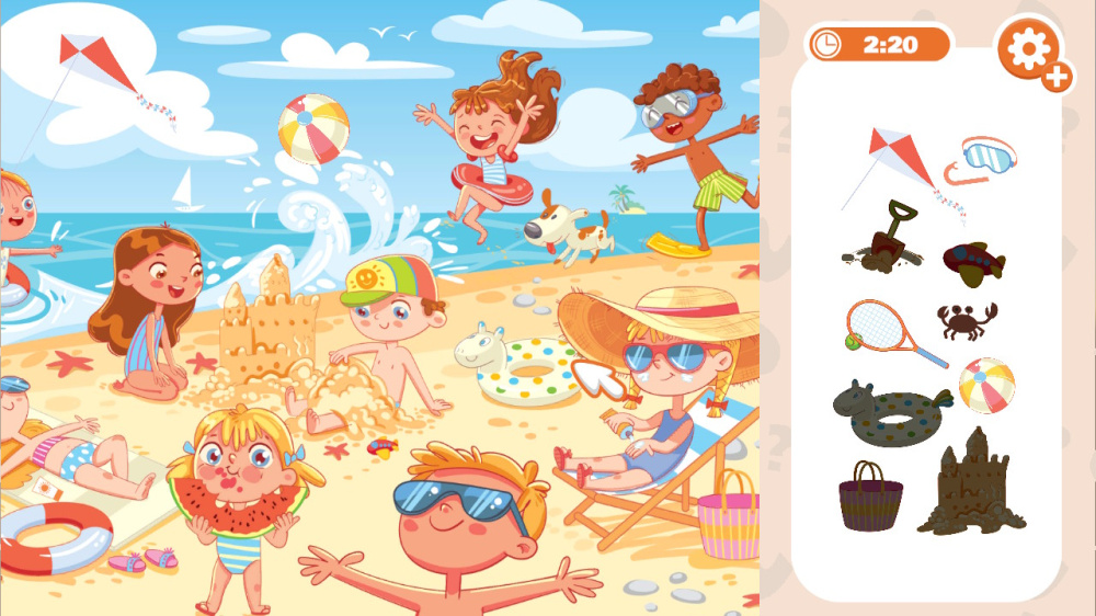 Hidden object puzzles feel even more magical when they take place under a bright blue sky with sand between your toes and laughter in the air. The image in front of you captures that joyful energy perfectly. A group of children plays on a sunny beach, building sandcastles, splashing in the water, flying kites, and soaking up summer fun. At first glance, it feels like a carefree holiday snapshot. But look a little closer and the real challenge reveals itself. Everyday objects hide cleverly inside the scene, waiting for sharp eyes to spot them all.