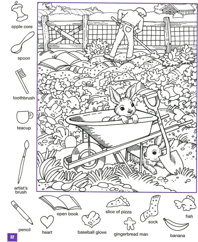 Sometimes the artist hides objects behind or within other objects. The gardener’s tools, the plants, and even the items the gardener is working with might hold hidden clues to the location of the bunnies. For example, look behind the gardening tools or around the edges of the raised bed to see if something unexpected is peeking out.