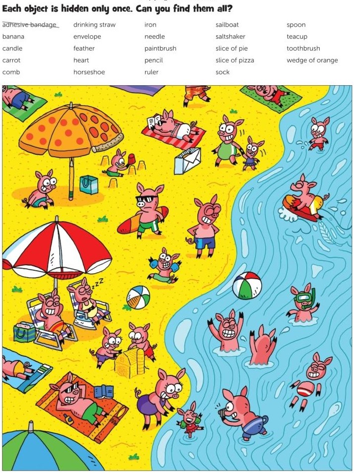 Hidden picture puzzles hit a whole new level of fun when they combine humor, color, and a playful story. The image in front of you does exactly that. A sunny beach filled with cheerful pigs splashing in the water, lounging under umbrellas, building sandcastles, and enjoying a carefree day by the shore. At first glance, it feels like a lively cartoon scene bursting with energy. Look closer and the real challenge begins. Dozens of everyday objects hide cleverly across the sand and waves, each placed only once and waiting for sharp eyes to uncover them.