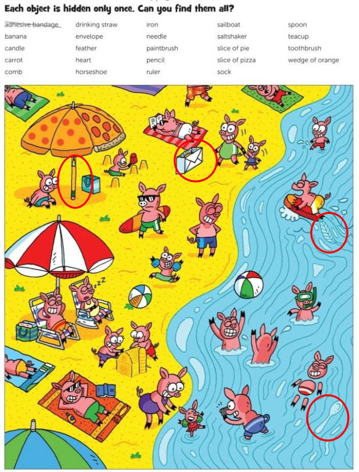 The brilliance of this puzzle lies in how naturally the objects blend in. A straw hides among beach toys. A slice of pizza echoes umbrella shapes. A needle borrows a line from water ripples. A ruler disguises itself along edges. A feather blends into motion and texture.