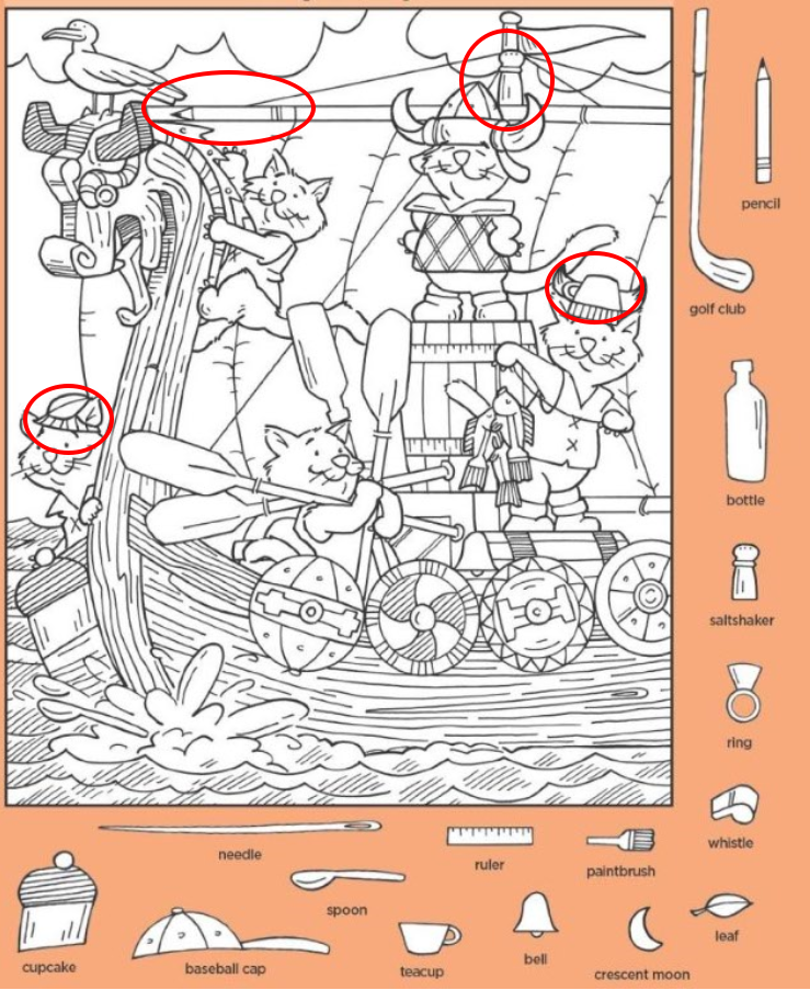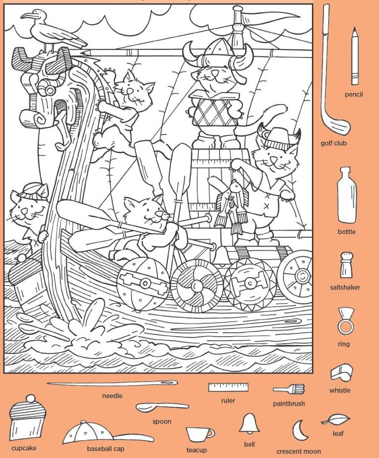 But take a closer look at the border of the image and you will notice something intriguing. Surrounding the scene is a list of everyday objects that do not naturally belong on a Viking ship. A pencil. A golf club. A bottle. A salt shaker. A ring. A whistle. A cupcake. A baseball cap. A teacup. A bell. A crescent moon. A leaf. A needle. A ruler. A paintbrush. A spoon.