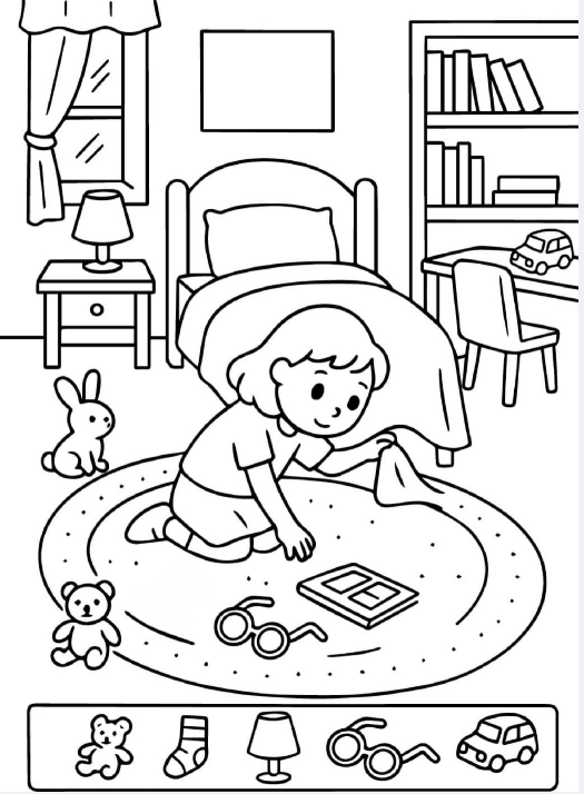The teddy bear might echo the shape of another toy. The sock may blend into fabric folds. The lamp could disguise itself among straight lines. The glasses might hide within curved outlines on the rug.