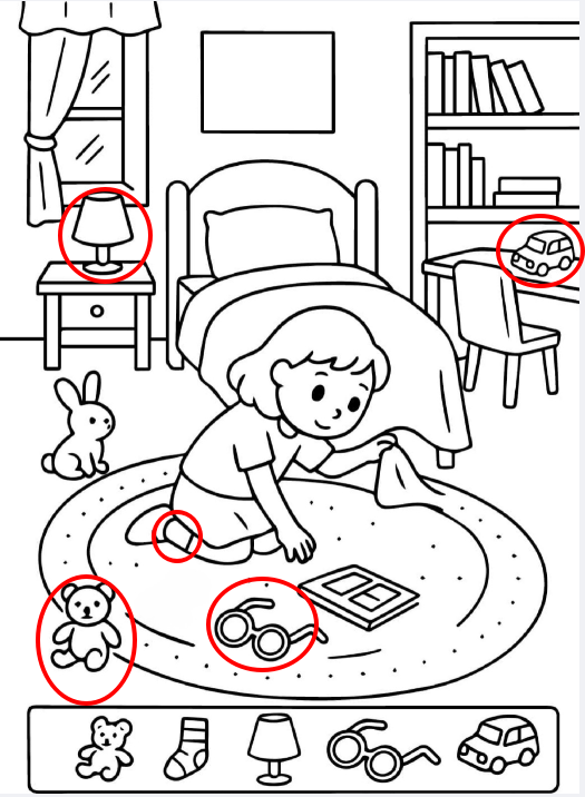 Busy images can overwhelm the brain. Simple scenes do the opposite. They slow the mind down and encourage careful observation. This kids bedroom puzzle uses space intentionally. Every object has room to breathe, which makes each hidden item harder to notice, not easier.