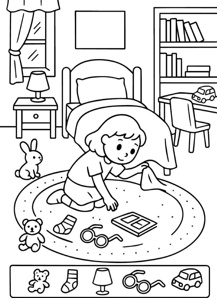 There’s something heartwarming about a child’s room — a space filled with imagination, laughter, and endless little surprises waiting to be found. This charming illustration captures a delightful moment of discovery, where a young girl kneels on her soft rug, tidying up her room and uncovering forgotten treasures along the way. From her scattered toys to her missing sock and glasses, this simple scene tells a story of curiosity, responsibility, and the quiet joy of making order out of chaos.
