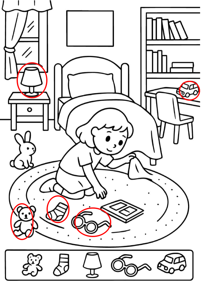 • Look for patterns. Items like toys, clothes, or books often hide among similar shapes.