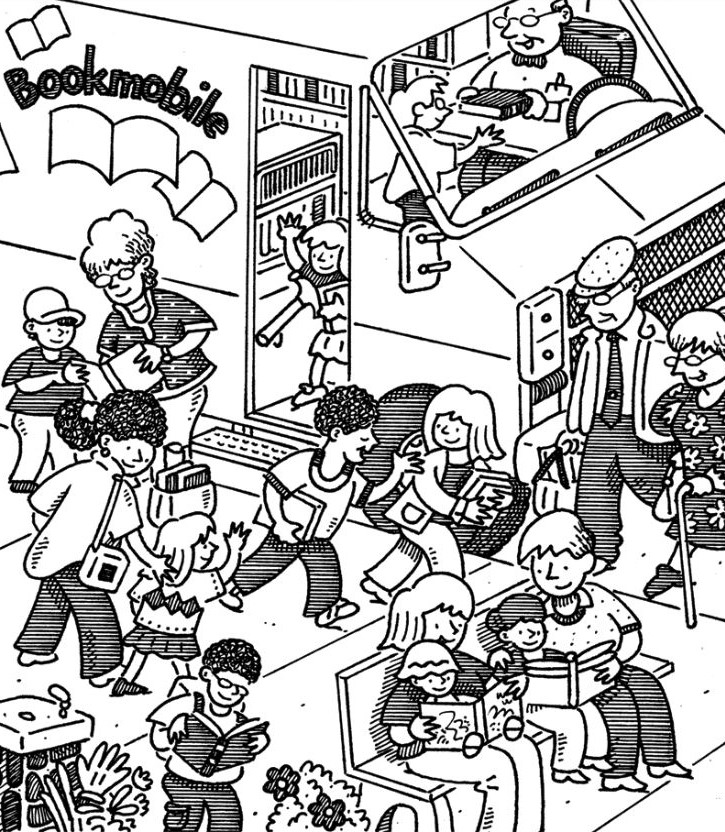 At the center of the image stands the Bookmobile, a traveling library filled with stories that connect people. A friendly driver hands out books, while excited children line up, eager to borrow their next adventure. The scene hums with movement — from a young reader waving at the door to an older gentleman leaning on his cane, enjoying the buzz around him. Each person seems to have a story of their own.