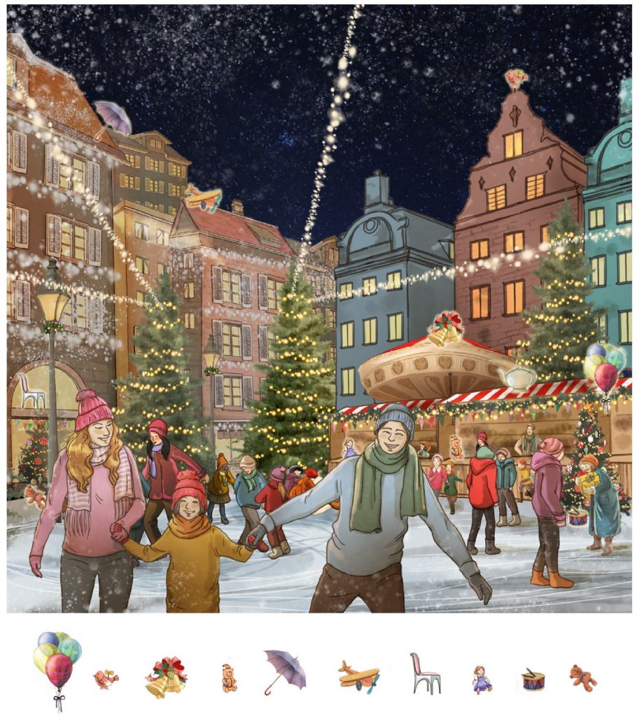 Children see magic first. They notice the skaters, the lights, the festive energy. Finding objects becomes a game layered on top of a winter story they already love.