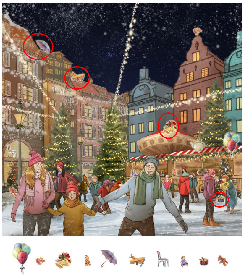 One look at this winter scene and you can almost hear the music floating through the cold night air. Snow falls gently under a dark starry sky. Strings of lights stretch across the town square like glowing ribbons. Families glide across an ice rink, hands linked, laughter frozen in motion. A cozy Christmas market glows in the background, surrounded by tall evergreen trees dressed in warm golden lights. At first, it feels like a peaceful holiday postcard. Then you notice the small icons at the bottom. Balloons. A bell. A teddy bear. An umbrella. A chair. A toy airplane. Suddenly, this charming winter festival transforms into a hidden picture puzzle that invites you to slow down and look closer.