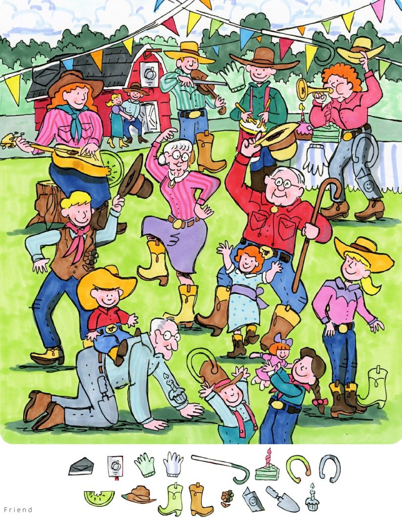 This cheerful barn dance scene is not just a celebration. It is also a cleverly designed hidden picture puzzle, packed with everyday objects quietly tucked into the chaos of joy. What starts as a warm visual story slowly transforms into an engaging challenge that rewards focus, patience, and curiosity.