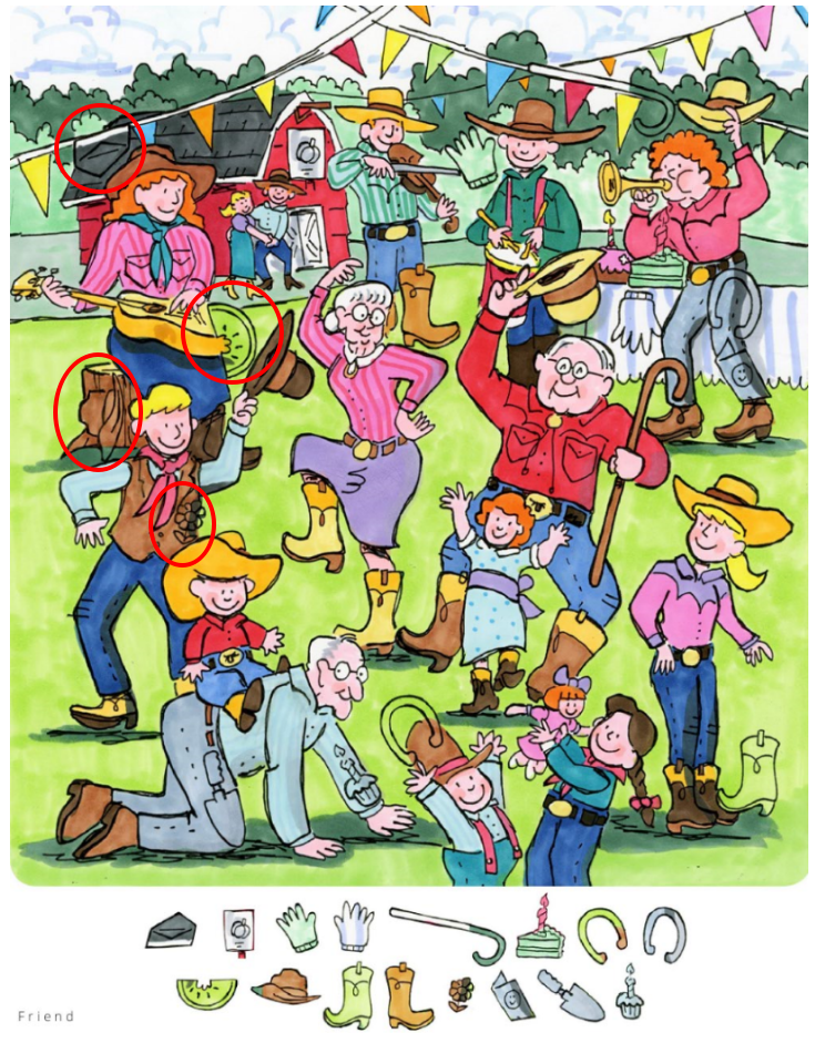 These items feel natural in a rural celebration, which makes them even harder to spot. A glove could be mistaken for a waving hand. A boot blends into a pile of dancing feet. A tool hides among props and instruments.