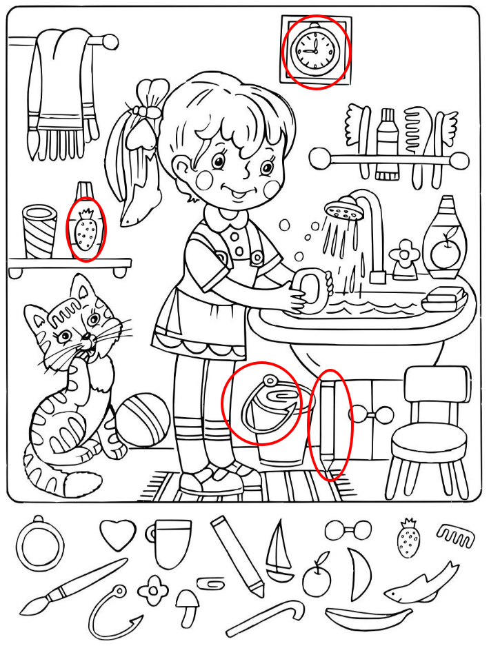 This is a hidden objects coloring page designed to turn an everyday routine into a fun visual challenge. Shapes and small items hide quietly throughout the scene, inviting kids to slow down, look closely, and discover details they might otherwise miss.