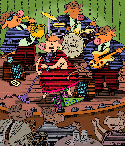 If you’ve ever wished you could step into a world where music comes alive with charm, color, and personality, this enchanting illustration delivers exactly that. The lively scene features an all-animal jazz band—The Buttercup Four—performing onstage with infectious energy, vibrant expressions, and a splash of humor that instantly pulls you into their world. From the swaying pig vocalist in a bright red dress to the horn-blowing, guitar-strumming, and drum-beating bandmates beside her, this artwork captures the heart and soul of a bustling jazz night.