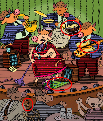 Find mug, spoon, crown and bat.