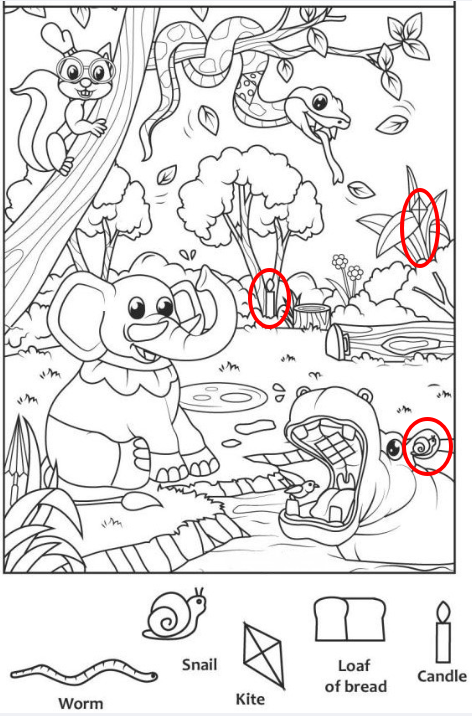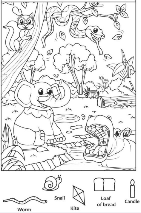 But this illustration isn’t just a fun jungle picture. It’s a hidden object puzzle designed to sharpen observation skills, spark imagination, and keep eyes moving from corner to corner. Once you notice the list of objects at the bottom—worm, snail, kite, loaf of bread, and candle—the scene transforms into a visual treasure hunt waiting to be solved.