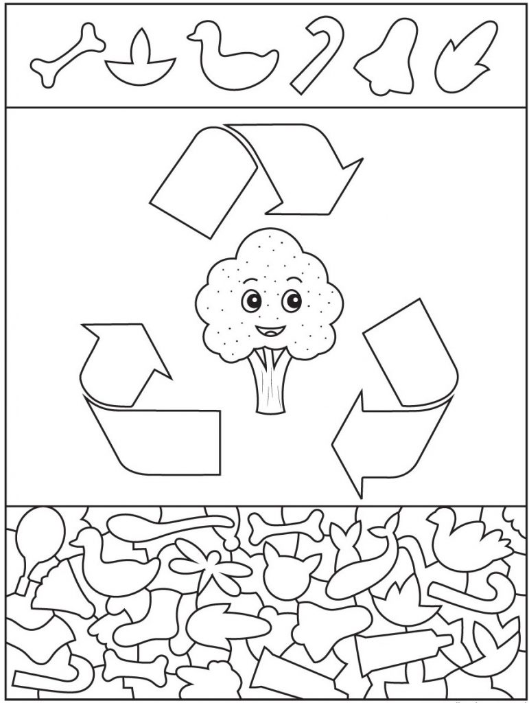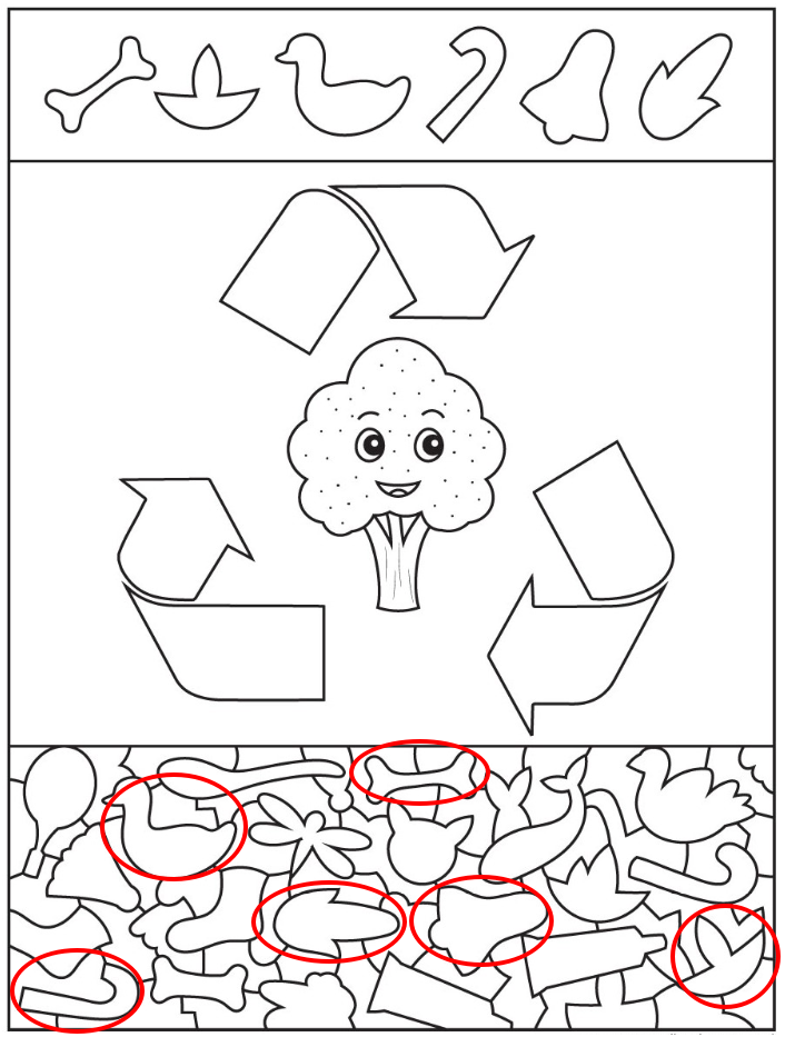 This recycling themed hidden shapes puzzle transforms a simple educational illustration into an engaging visual challenge. By placing recognizable outlines within a dense cluster of overlapping figures the artist invites viewers to slow down and explore every detail.