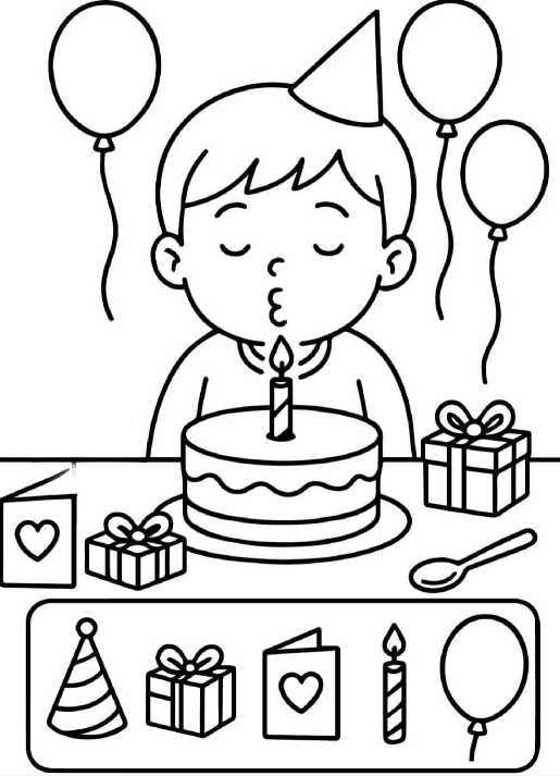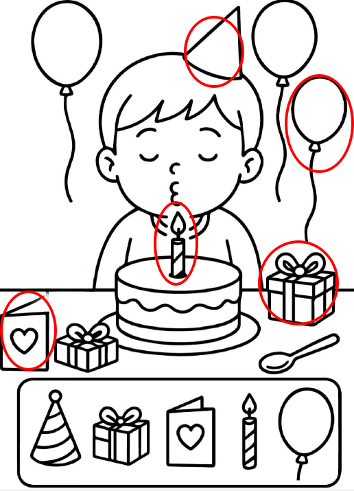 Divide the picture into sections. Look carefully at the balloons first, then move to the child’s hat, the cake, and the table objects. Trace the lines of each item with your eyes.