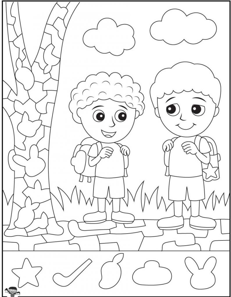 This charming outdoor hidden object puzzle proves that simple illustrations can create meaningful learning experiences. Two smiling boys, a textured tree, and fluffy clouds form more than just a coloring page. They create an interactive challenge.