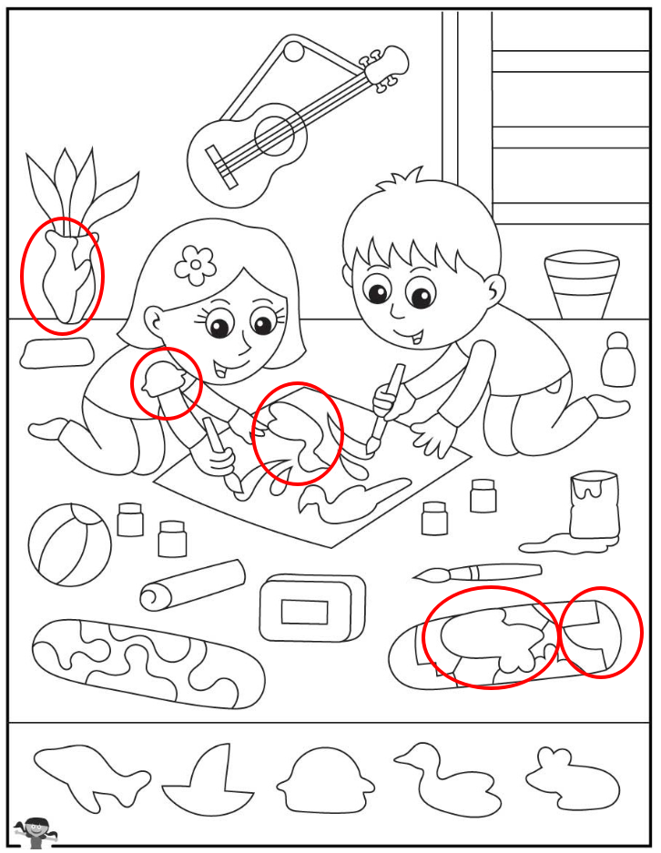 For example, if a child searches for the duck silhouette, they must compare curves and outlines carefully. They scan the painted shapes on the paper. They look at the skateboard designs. They examine background details.