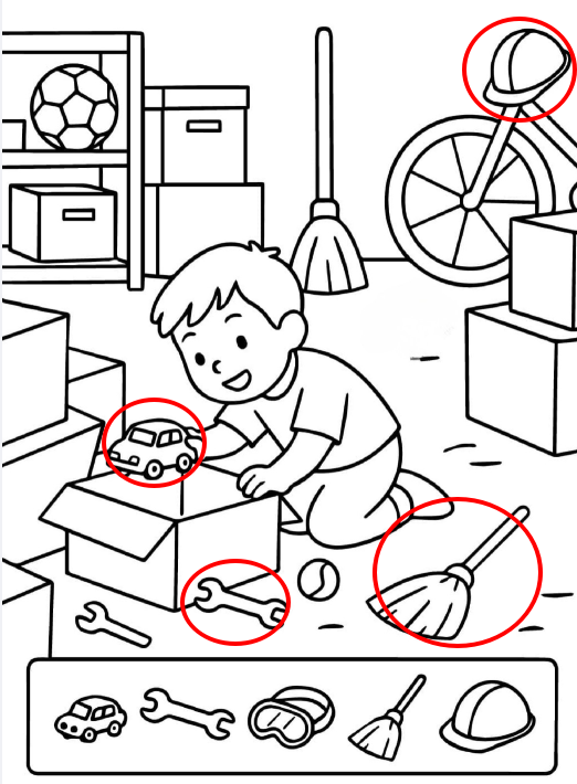 At first glance, this image feels like a simple black and white drawing of a child playing in a garage. Boxes sit stacked around the room. A bicycle leans quietly in the corner. Tools and toys scatter across the floor in that perfectly imperfect way only kids can create. But look closer and something interesting happens. This is not just a drawing. It is a hidden picture puzzle designed to challenge the eyes, slow the mind, and quietly build powerful cognitive skills.