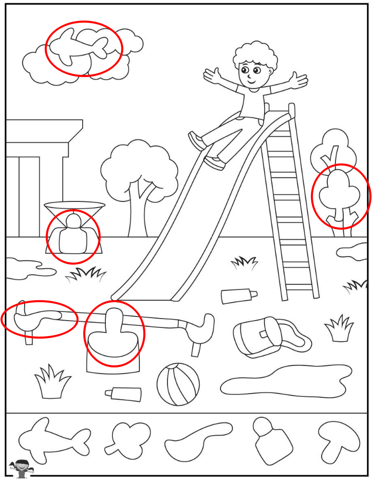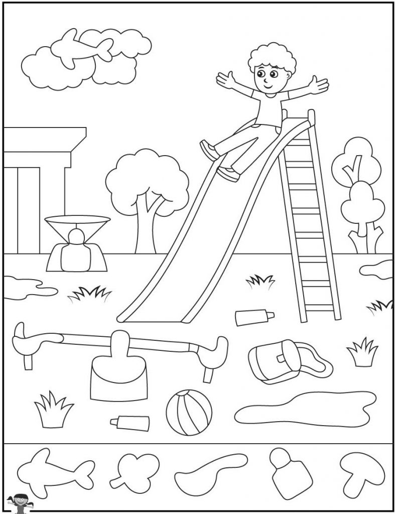 The playground illustration uses simple line art without color. That choice makes the puzzle significantly harder.