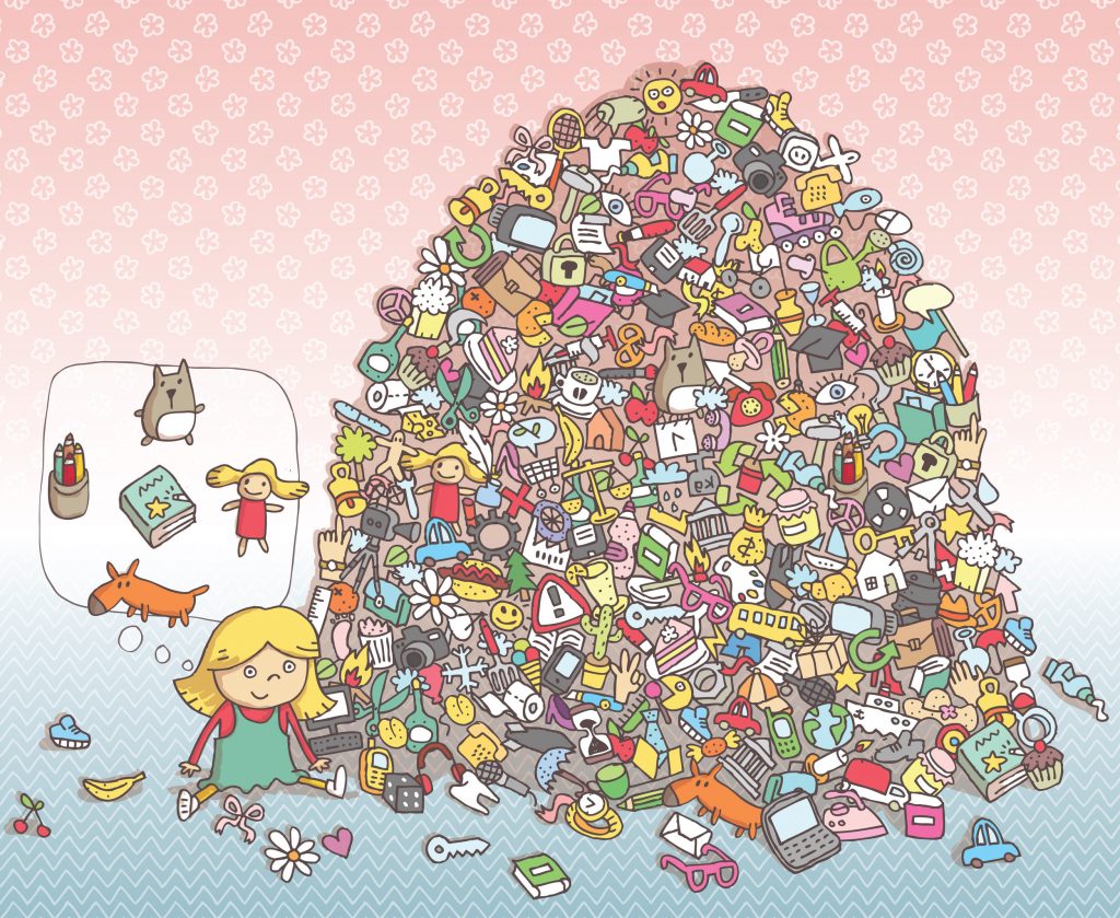 This illustration flips the script. The pile isn’t something to clean up. It’s something to explore. Every object feels intentional, inviting your eyes to wander and your brain to engage. The mess becomes a treasure hunt.