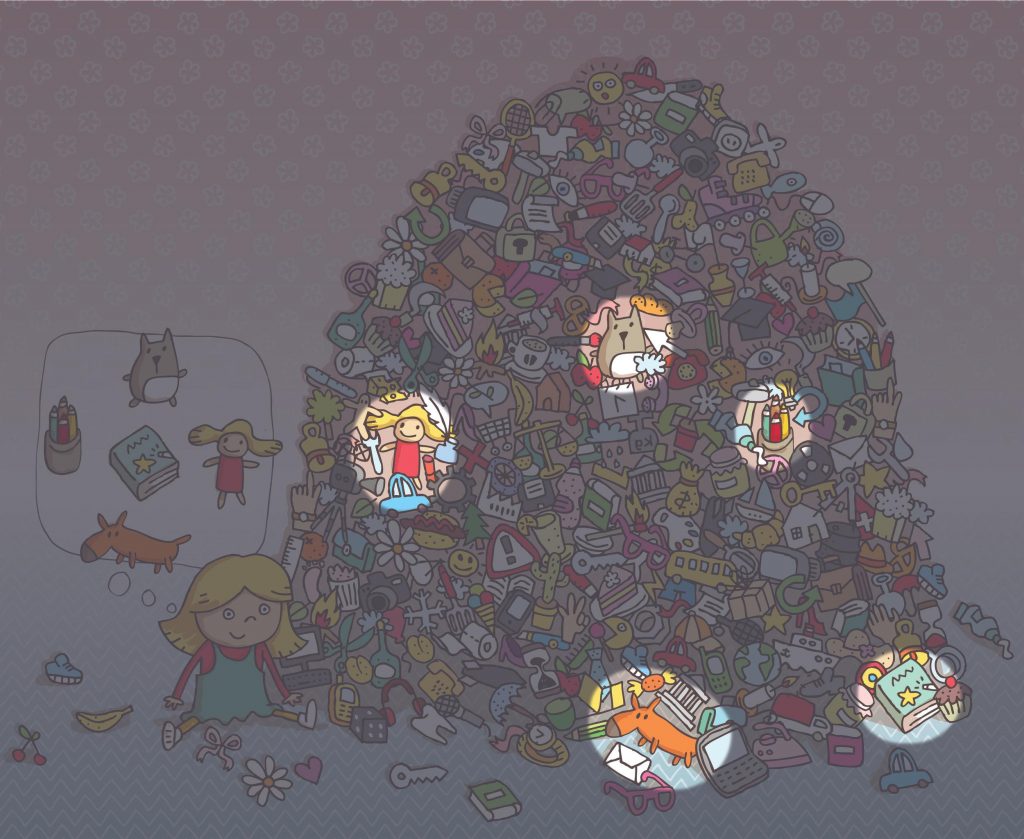 Is the pile a reflection of her imagination? Is she sorting through memories? Is she learning to focus in a world full of distractions?
