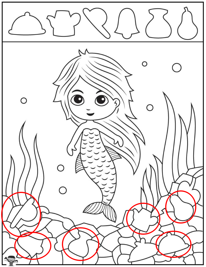 Children enjoy the mermaid theme and the playful search. Adults enjoy the mental challenge of breaking visual habits. You think you know what a bell or heart looks like, but when it blends into coral shapes, your brain hesitates.