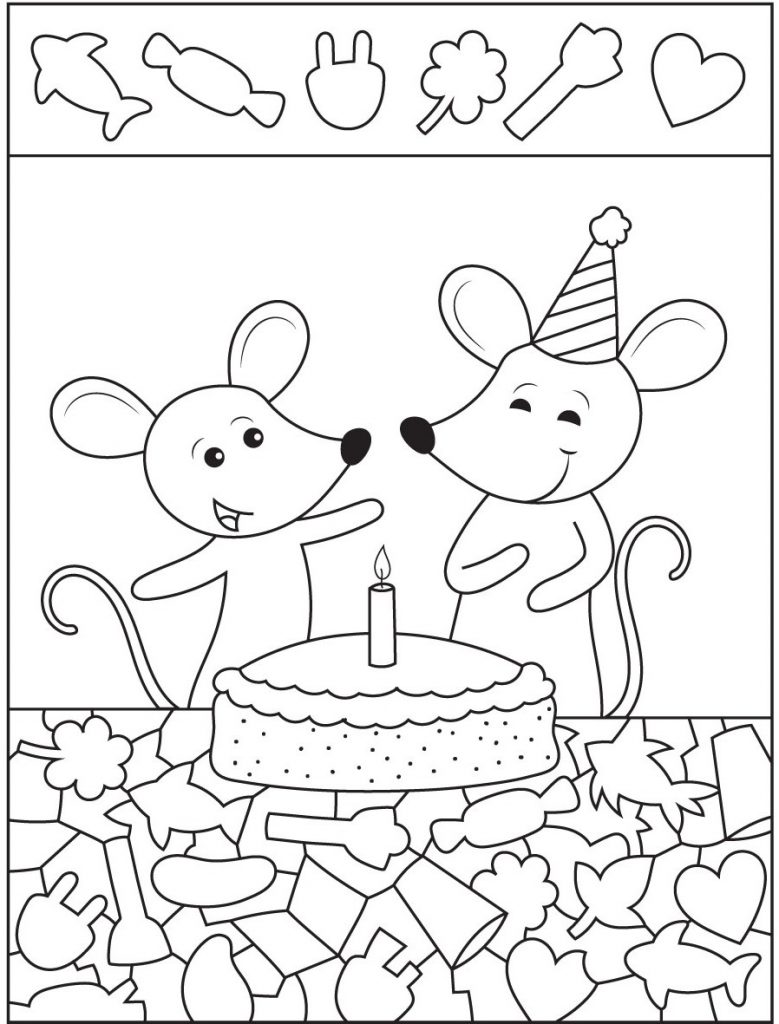 At first glance this illustration looks like a simple and adorable birthday moment. Two cheerful mice stand together behind a cake with a single candle glowing on top. One mouse wears a festive party hat while the other raises its arm as if celebrating the special occasion. The scene feels lighthearted, warm, and playful, like a page from a children’s activity book.