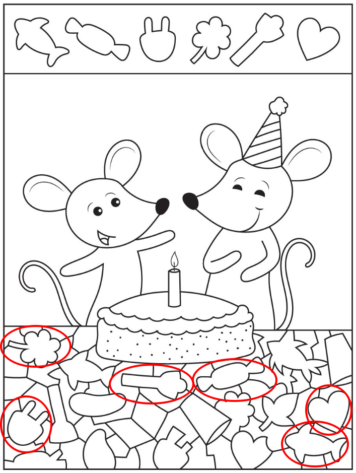 Take another look at the birthday scene and continue your search. Somewhere among the shapes beneath the cake, the hidden objects are waiting to be discovered.