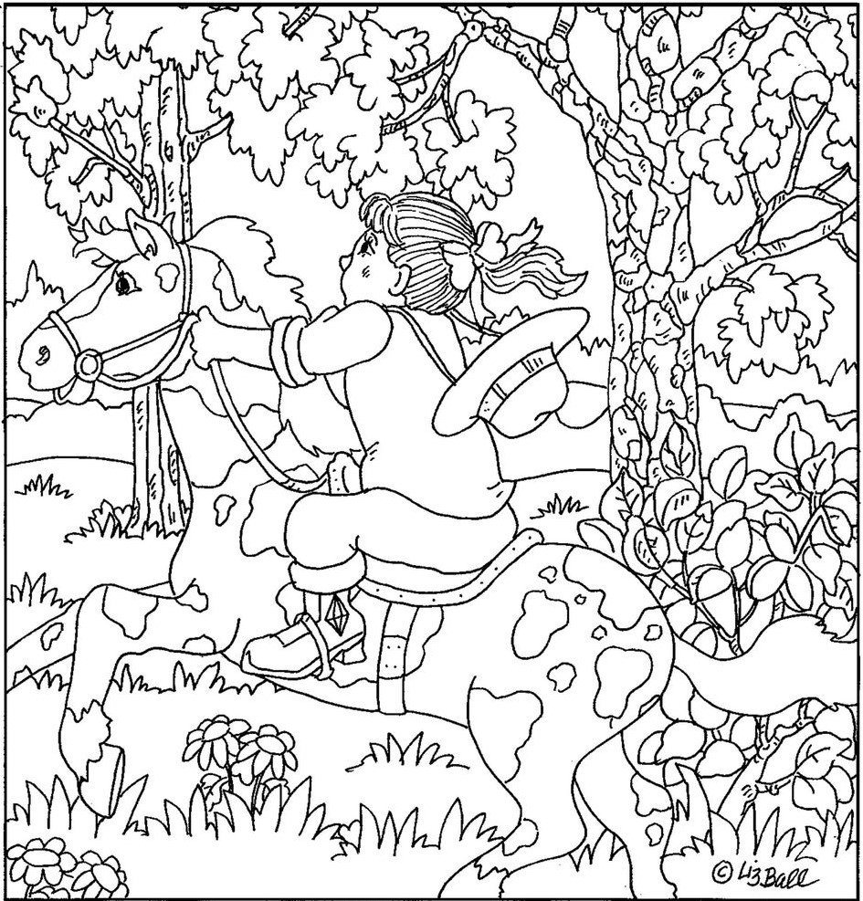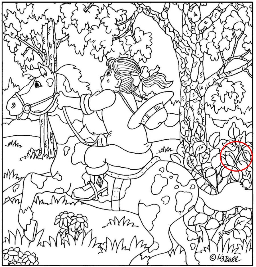 Look closely at the bark of the trees, the patches on the horse’s coat, or the shapes of the leaves. Could that rounded leaf actually be a cup? Is that cluster of branches forming the outline of a boot or a hat? Maybe a flower hides a small animal shape within its petals.