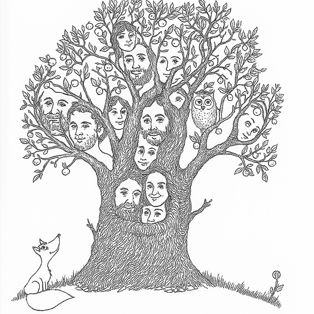 Higher up, the branches twist and turn, each forming new faces among the leaves. These could represent future generations, growing outward and upward. Each face is unique, mirroring the diversity and individuality found in any real family tree.