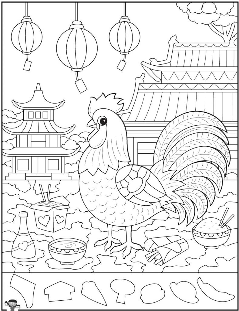 Some illustrations don’t just catch your eye—they pull you into an entire world of symbolism, tradition, and sensory delight. This lively scene featuring a majestic rooster standing proudly among lanterns, pagoda-style buildings, and traditional foods does exactly that. It’s more than a drawing; it’s a cultural celebration disguised as a playful hidden-object puzzle. And if you’re a fan of vibrant imagery, festive details, and brain-boosting challenges, this scene is the perfect blend of entertainment and discovery.