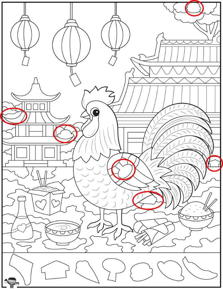 This stunning illustration is more than a picture—it’s a celebration of culture, tradition, food, and festive joy. Through its lanterns, architecture, and symbolic rooster, it draws you into a beautiful story. And through its hidden-object challenge, it sharpens your focus, engages your curiosity, and rewards your attention.