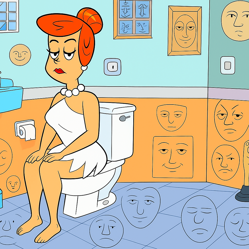 At first glance, the image looks humorous and cartoonish—a woman in a towel, sitting on a toilet, surrounded by an ordinary tiled bathroom. But the longer you look, the stranger it becomes. Suddenly, faces begin to emerge—from the floor tiles, the wall décor, even the toilet itself.