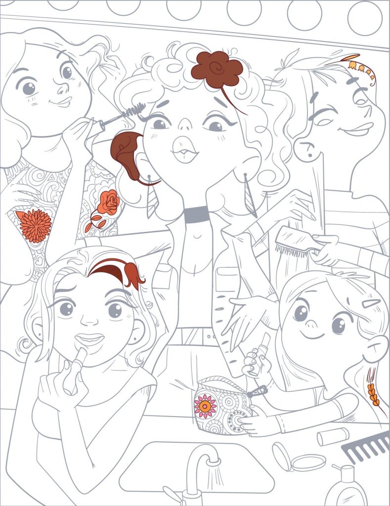 The setting feels familiar and welcoming. A shared mirror, soft lighting, and a group of girls enjoying a get-ready moment together. Every detail feels alive—hair in motion, hands mid-gesture, makeup scattered across the counter.